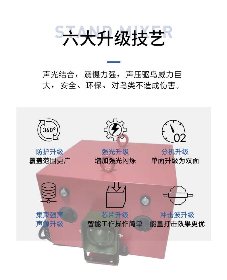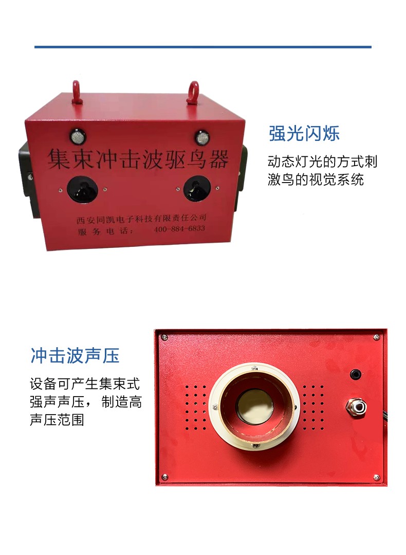 TK90系列集束冲击波驱鸟器是我公司研发设计的四级驱鸟产品,此驱鸟器是集电子炮技术、电子爆鸣技术、鸟天敌声、集束强声、强闪光等技术为一体,制造的综合型驱鸟装置,设备可产生集束式强声声压,制造高声压范围,使鸟类在此范围内耳膜无法承受,从而达到隔离鸟的目的。
